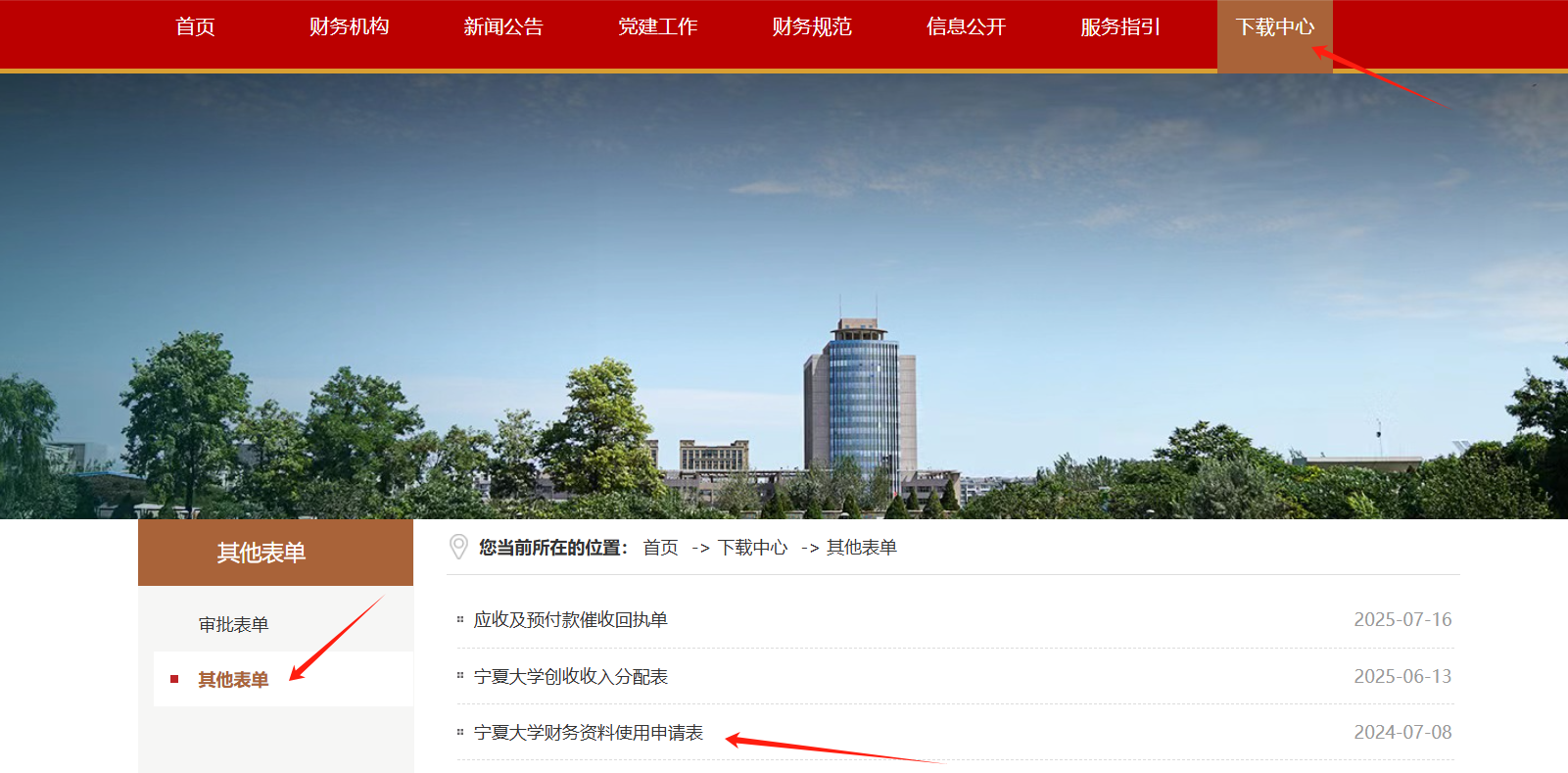 访问计划财务处信息门户网(https://jcc.nxu.edu.cn/index.htm)→“下载中心”→“其他表单”,下载《宁夏大学财务资料使用申请表》。