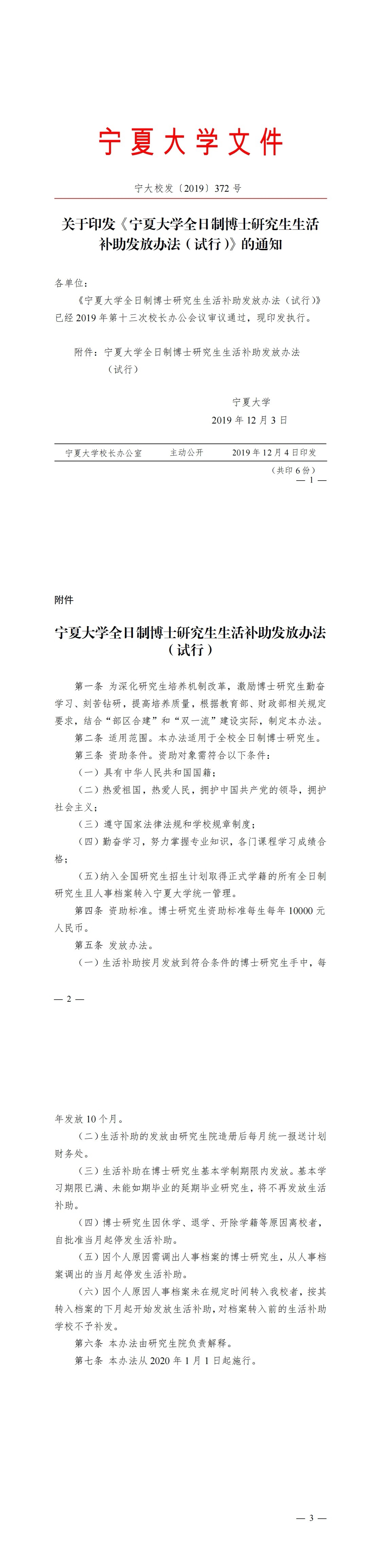 宁夏大学全日制博士研究生生活补助发放办法(试行)